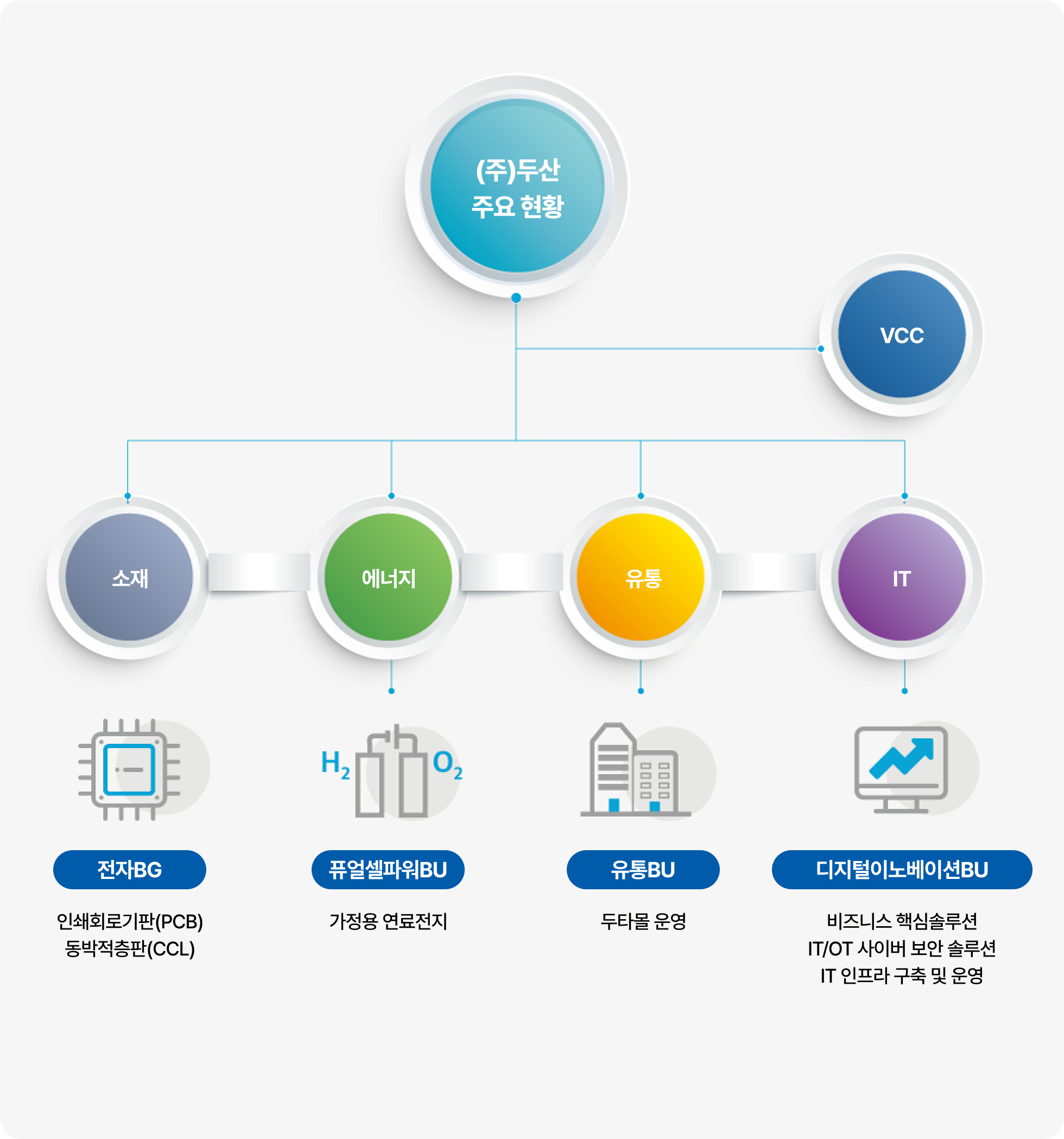 두산VCC는 유럽, 아시아, 미주 시장 전역에 형성되어 있는 두산그룹의 글로벌 네트워크를 관리하는 동시에 전자BG, 퓨어셀파워BU, 유통BU, 디지털이노베이션BU의 자체사업을 영위하고 있습니다.