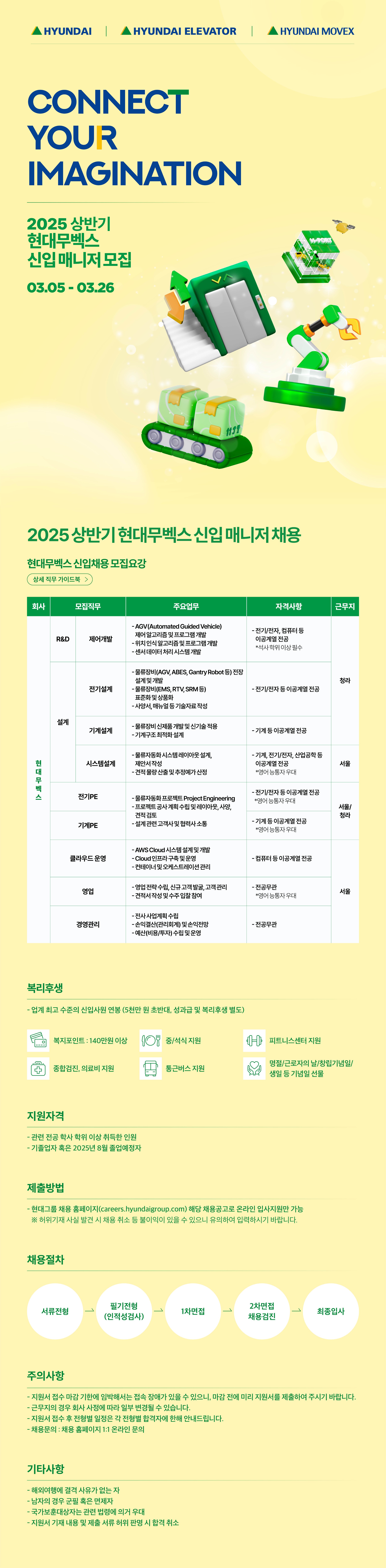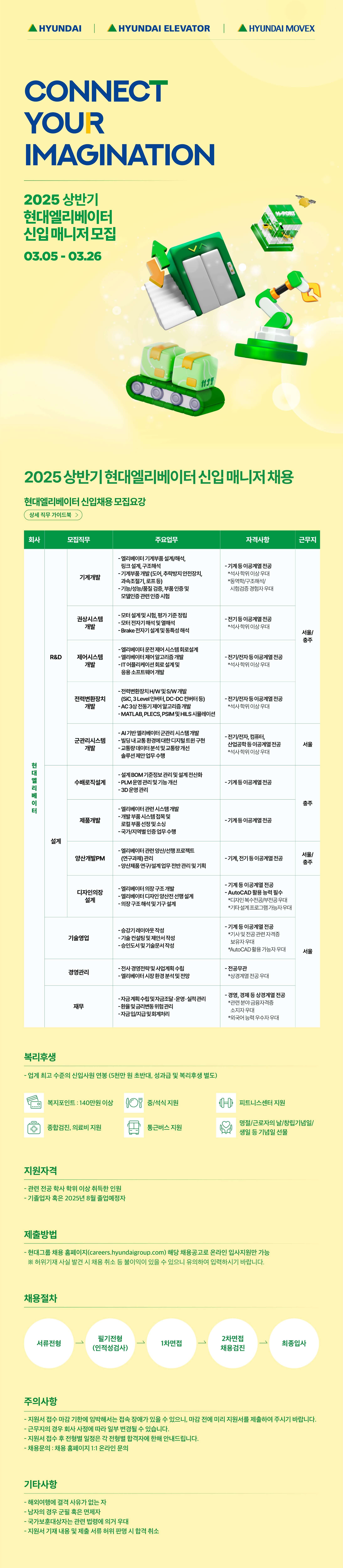 어려운 시기에 취업 준비로 많이 바쁘시겠지만, 잘 준비하셔서 보이는 곳이든 보이지 않는 곳이든 현대엘리베이터 구성원으로 함께 즐겁게 일하고 성장해 갈 수 있길 바라겠습니다. 파이팅입니다!